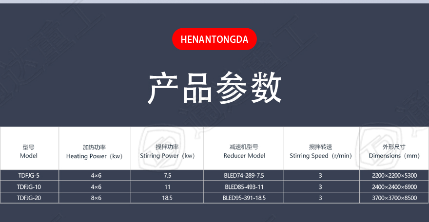技術參數| 型號 | 加熱功率(kw) | 攪拌功率(kw) | 減速機型號 | 攪拌轉速(r/min) | 外形尺寸(mm) |