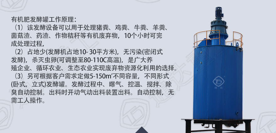 性能特點有機肥發酵罐可以用于處理豬糞、雞糞、牛糞、羊糞、菌菇渣、中藥渣、作物秸稈等有機廢棄物,10個小時可完成無害化處理過程,占地少(發酵機僅占地10-30平方米),無污染(密閉式發酵),徹底殺滅病蟲卵(可調整至80-110℃高溫),是廣大養殖企業、循環農業、生態農業實現廢棄物資源化利用的理想選擇。
