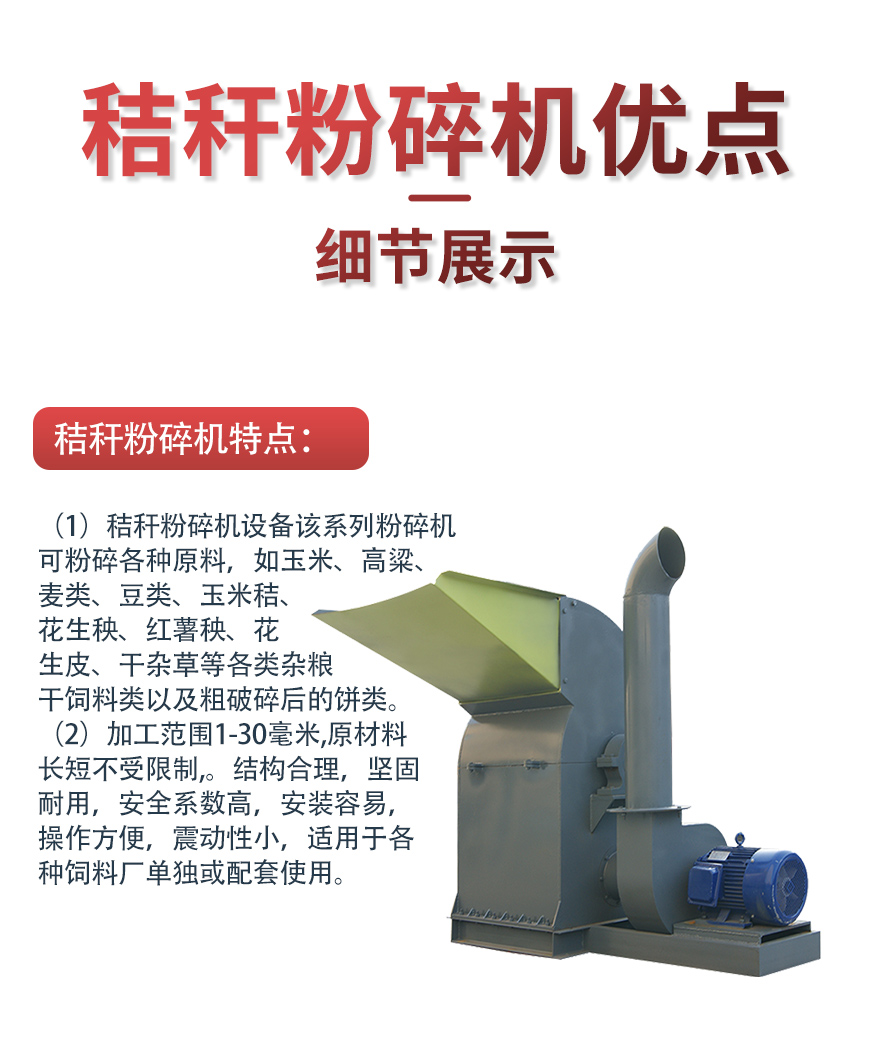 性能特點1.秸稈粉碎機設計合理、制造質量可靠、具有結構簡單、操作方便、體積小、占地少、省工、省電的特點