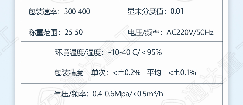 技術參數| 型號 | 功能 | 包裝材料 | 適用對象 | 適用行業 | 物料類型 | 電壓 | 功率 | 包裝膜寬 | 制成袋尺寸 | 包裝速度(袋/分鐘) | 重量 | 外形尺寸(mm) | 包裝類型 | 自動化程度 |